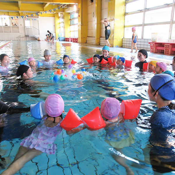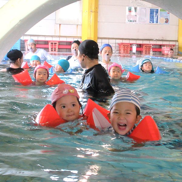 スイミングと体操で体力と度胸がつきます。 ビバスポーツアカデミーにて年間を通して開催。 園にて送迎しております。