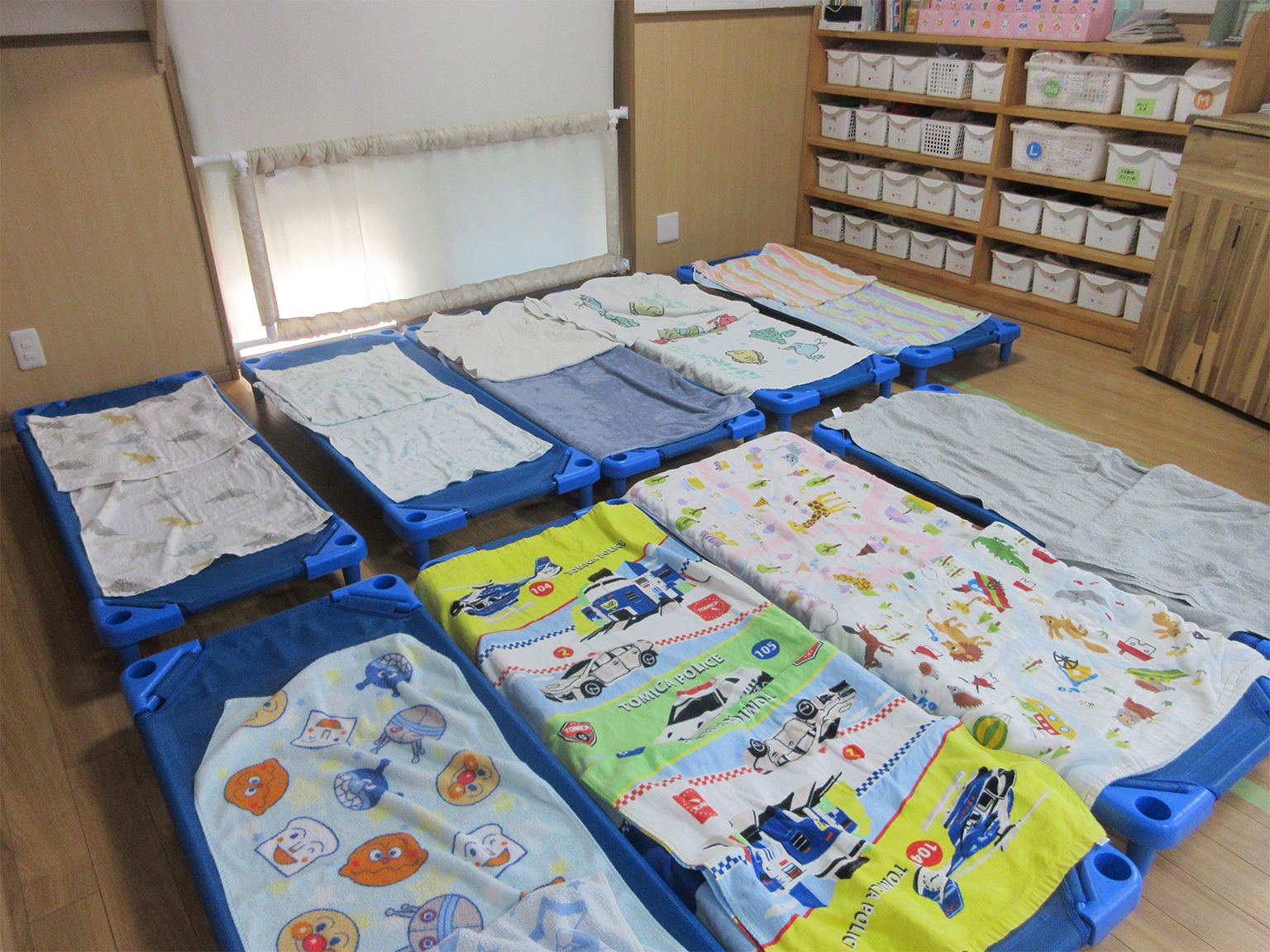 お昼寝の時間は、成長に必要な休息をしっかり取れるよう、静かで安心できる環境を整えています。
